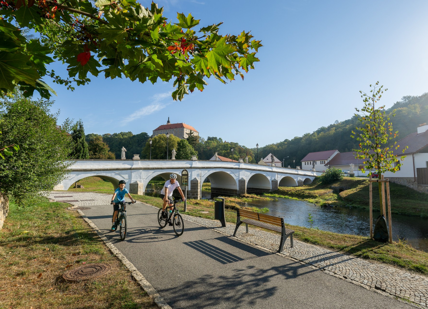 Váš výlet začíná u renesančního zámku Náměště nad Oslavou, který shlíží z výšiny na celé město. Pokud budete chtít, můžete hned na začátku navštívit některý z jeho tří prohlídkových okruhů. Přímo v Náměšti můžete obdivovat také „moravský Karlův most“, barokní klenot s 20 sochami vedoucí na náměstí. Poté vás čeká ještě pár desítek metrů přes centrum města a napojíte se na cyklotrasu (CT) 5106, která vás vyvede z města ven.